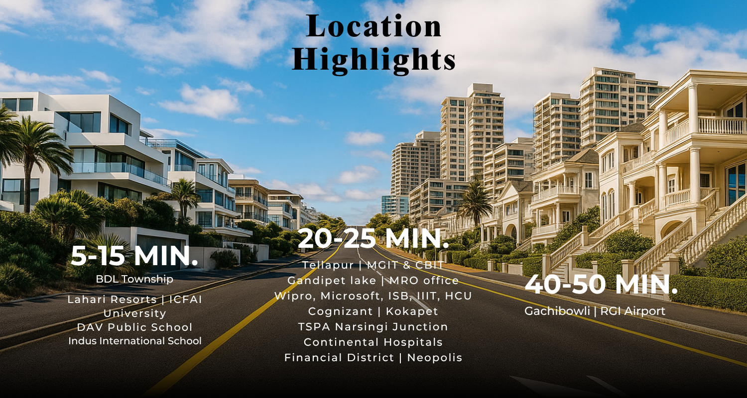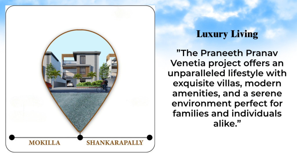 Mokila is an upcoming location for luxury villas due to its green spaces, connectivity, and eco-friendly living. Excellent connectivity to schools, colleges, metro, hospitals, banks, and markets makes Mokila a promising hub for real estate investment.
